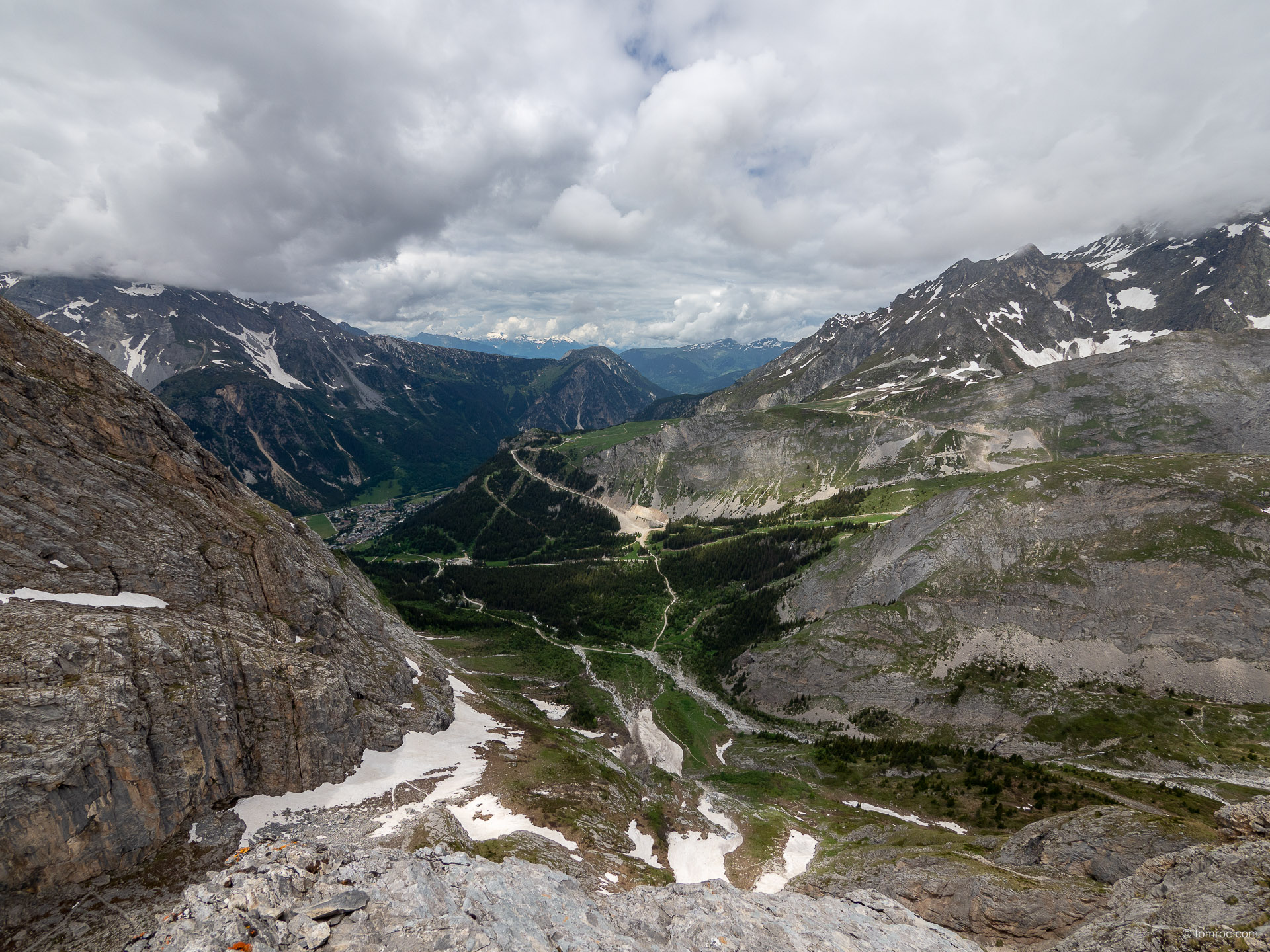 Nous prenons finalement la route du retour pour aller rejoindre le lieu de rendez-vous de notre car, en repassant par la vallée au nord des arêtes de la Vanoise. Au passage, nous pouvons voir l’itinéraire de la course que nous envisagions initialement pour ce dimanche : Pointe de la Petite Glière : Arête S (D- 4c III).