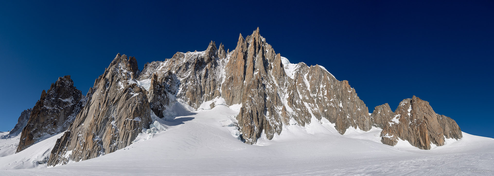 La voie normale est moins photogénique mais finalement plus plaisante que la monotone Gervasutti, puisqu’elle fait évoluer en neige et impose quelques pas d’escalade facile et nous impose une petite recherche d’itinéraire. Nous atteignons le pied de la Tour Ronde et engageons le grand contournement. L’enjeu est de réussir à contourner efficacement, et de manière sécurisée évidemment, le patchwork du glacier qui se positionne entre nous et nos skis.